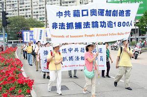![]() 香港学员在五月一日游行,抗议中共当局借口奥运加剧迫害。 |