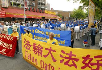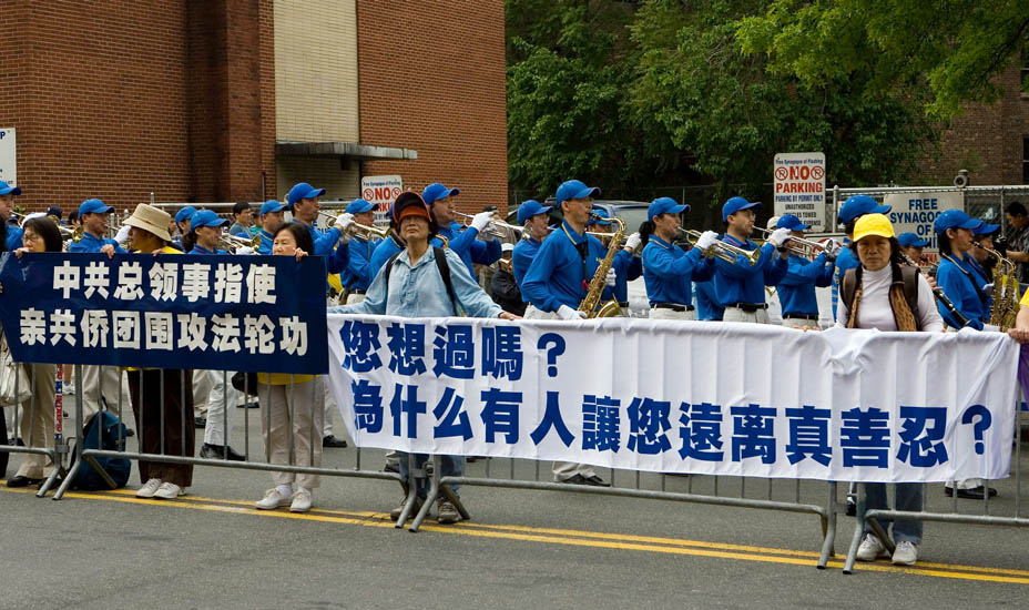 ![]() 由法轮功学员组成的天国乐团演奏“法轮大法好”。 |