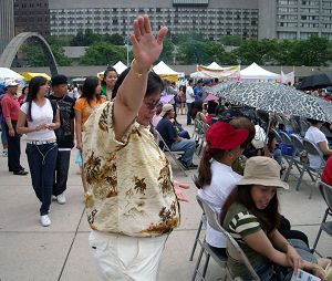 当艺术团成员为观众展示法轮功功法的时候,引来了很多人的注目。后排有些观众站起来,开始跟着学。