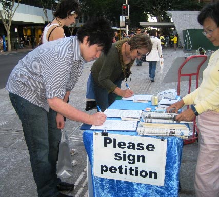 正值放学和下班的尖峰时段,来往的学生、上班族及游客们皆被法轮功的真相标语和图片展板所深深震撼。人们感到震惊与愤怒,签名反对中共的迫害。