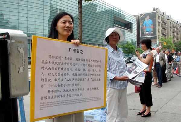 在“广而告之”的展板上写着:“你知道吗?在美国,宪法保障所有人的拥有和平集会和发放信息资料的权利。如何针对行使此权利的人而做出的攻击行为,包括:推、操、踢人、打人、以及向其吐痰等,根据纽约法律中仇恨犯罪的条款,都可以“二级严重骚扰罪”或“三级攻击罪”而对攻击者予以刑事起诉。抢夺相机、展板或报纸等行为,属于抢劫罪,会根据美国刑事法条款予以起诉。
