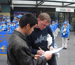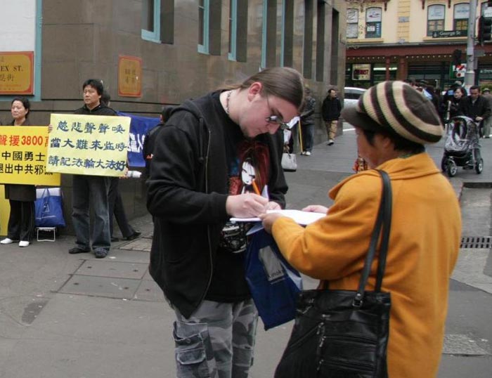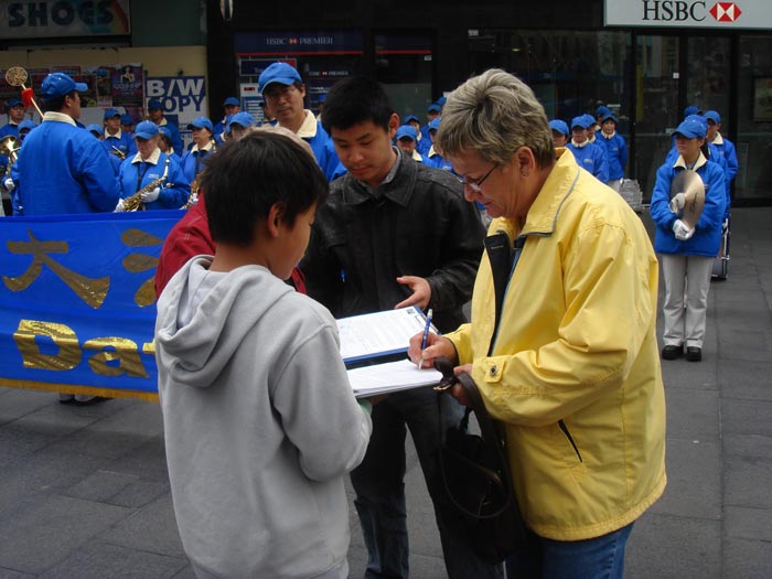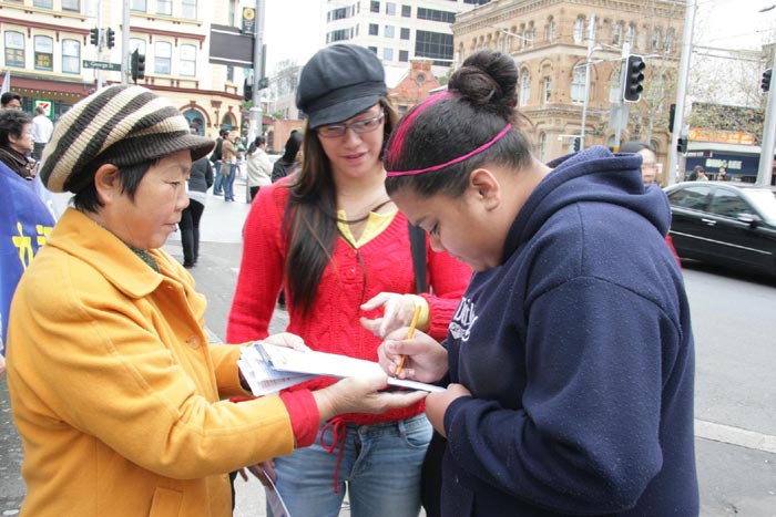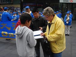 集会的同时,退党服务中心义工们手举着横幅和展板在市区的乔治街上举行真相长城,揭露中共暴政给中国人民带来的灾难,把“爱国不等于爱党”、“没有共产党,才有新中国”、“天灭中共,天佑中华”等信息传递给人们。同时在唐人街退党服务中心的摊位上用大屏幕投影反复播放中共暴徒围攻法拉盛退党服务中心,殴打法轮功学员、退党义工等实况录相。法拉盛暴力事件引起澳洲社会的关注,在悉尼的退党集会吸引了许多路人进一步了解真相,很多人都乐意拿法轮功学员所递的法拉盛事件真相特刊,正义民众纷纷签字声援。