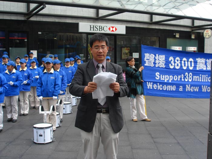 澳洲法轮大法佛学会发言人约翰•戴乐在集会上发言,介绍了法轮功是什么及中共发动这场大规模的镇压运动,导致数千名法轮功学员被迫害致死。九年过去了这种迫害还在继续着,全球的法轮功学员面临巨大的压力,保持大善、大忍,不断的向世人讲真相,目前已有三千八百万明白真相的人们退出中共及其体系。最后他说:“我想在大家了解到真相后,你就有责任告诉你身边的人中国发生的真实情况。”
