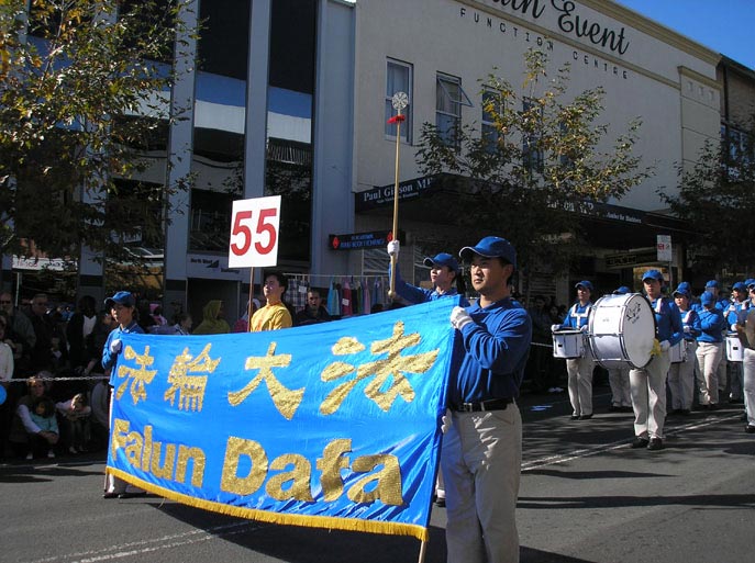 法轮功学员的方阵由四个方阵组成。天国乐团、古装仙女、花车和腰鼓队迎来了道路两旁市民们的热烈掌声。在主席台上,主持人向人们介绍了法轮大法洪传于全世界八十多个国家和地区,有一亿人按照“真、善、忍”在修炼。