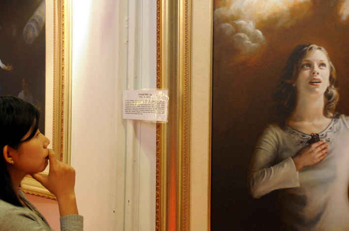 一对中年夫妇尽情的观赏展出的所有绘画作品。身材高大的丈夫看到一幅表现一位年轻妇女右手抱着宝宝正阅读《转法轮》的画像时,他情不自禁的说:“很美”;他的太太则目不转睛的一直看着那一幅“孤儿泪”, 中共的迫害造成了无数法轮功学员的家破人亡。画中的孩子,父母双双被迫害致死,孩子满腹辛酸,隐忍着眼泪,捧着父母的骨灰不知何去何从……。