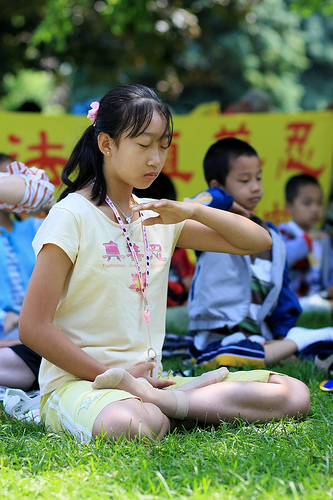 孩子们在炼静功时,一对西人老年夫妇和一位年轻人停在旁边观看了很长时间,年轻人问在发资料的明慧学校老师金谨说:“这是不是法轮功?他们是不是在中国受迫害?”金谨说:“是的。”