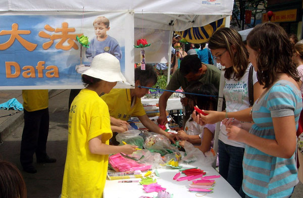 ![]() 法轮功学员教人们折叠莲花 |