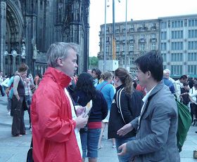 ![]() 科隆:大教堂前一位西人法轮功学员(穿红衣者)在给一个中国人讲退党大潮和法轮功受迫害真相。 |