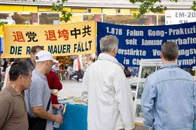 德国南部名城慕尼黑一直是游客向往的地方,中国游客也不例外。据退党中心的人士反映,这一天往来的大陆中国人好象特别多,有些人当场填表退出中共,有的人在退党横幅前频频留影,有的收下《九评共产党》,表示要好好看一看,有的十分感激的对退党中心的义工说:“感谢你们的努力”,还有的和义工们握手致意。