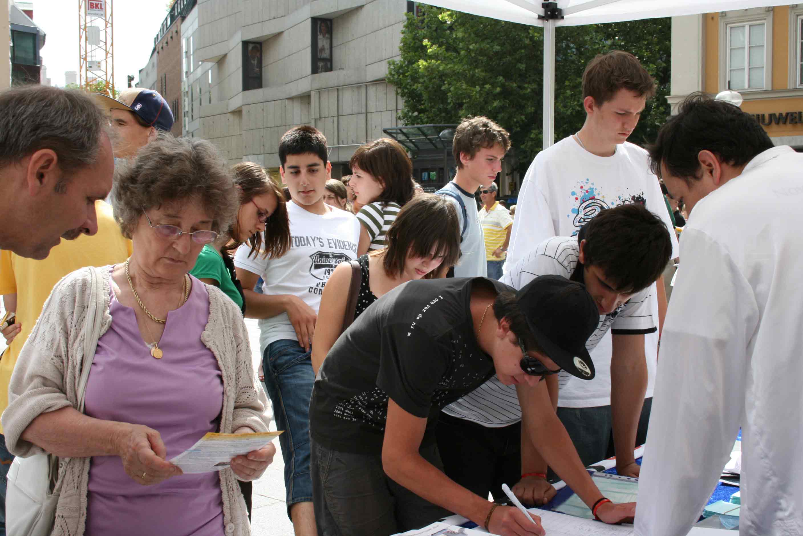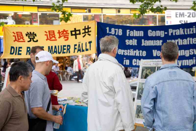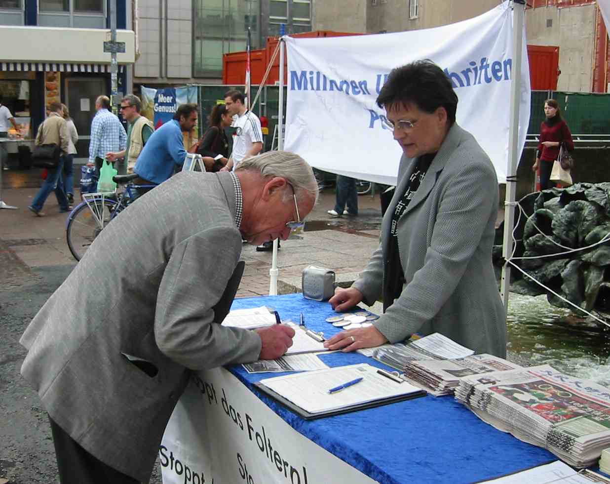 有好几个上了年纪的德国人,自述上个世纪六十年代是毛的追随者(Mao-Fans),但他们当时并不知道中国发生的真实情况。在后来的几十年的岁月中,真相一点点地显露,他们中的绝大部份人通过反思都成为了清醒的反共人士。这几位德国人马上就在要求停止迫害法轮功的签名表上签名了。