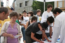 一个从法国来的交换中学生很仔细的看了中共迫害法轮功以及中共迫害中国人民的大幅图片,他向法轮功学员表示:“知道中共媒体只说自己好,不会报导这些消息”。他离开摊位几分钟后,又特地回来向学员索要法轮功网页,以便放到自己的个人网页上,让更多的人知道中共对法轮功的迫害。