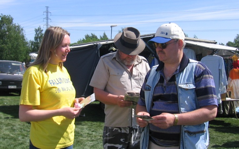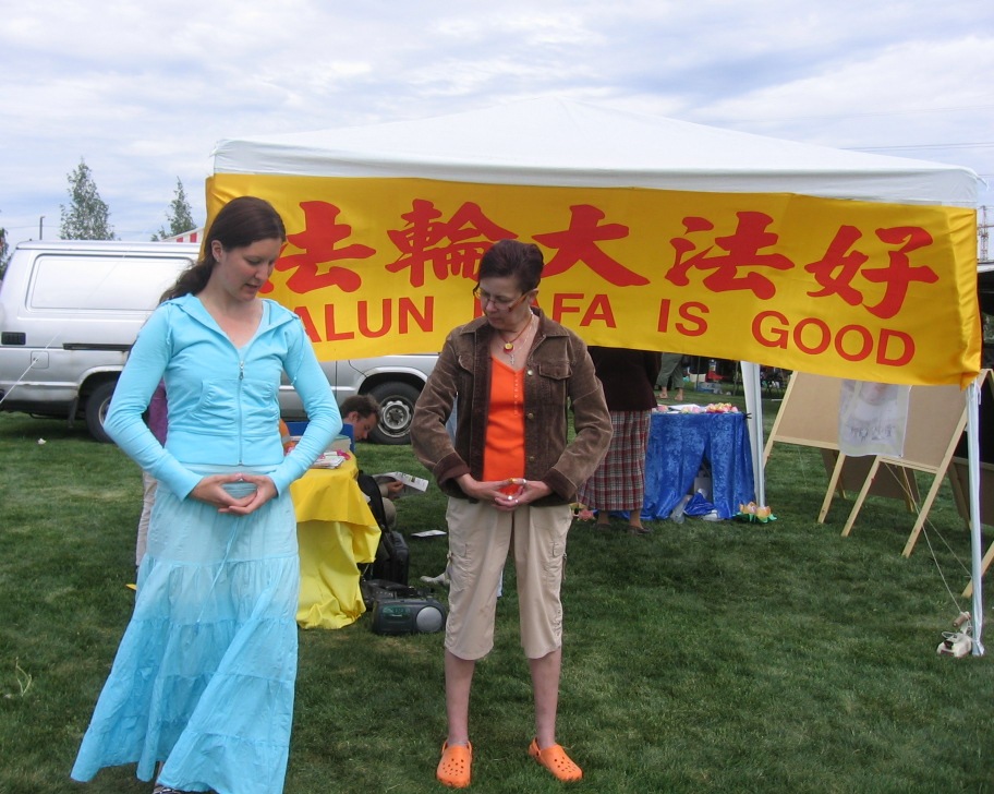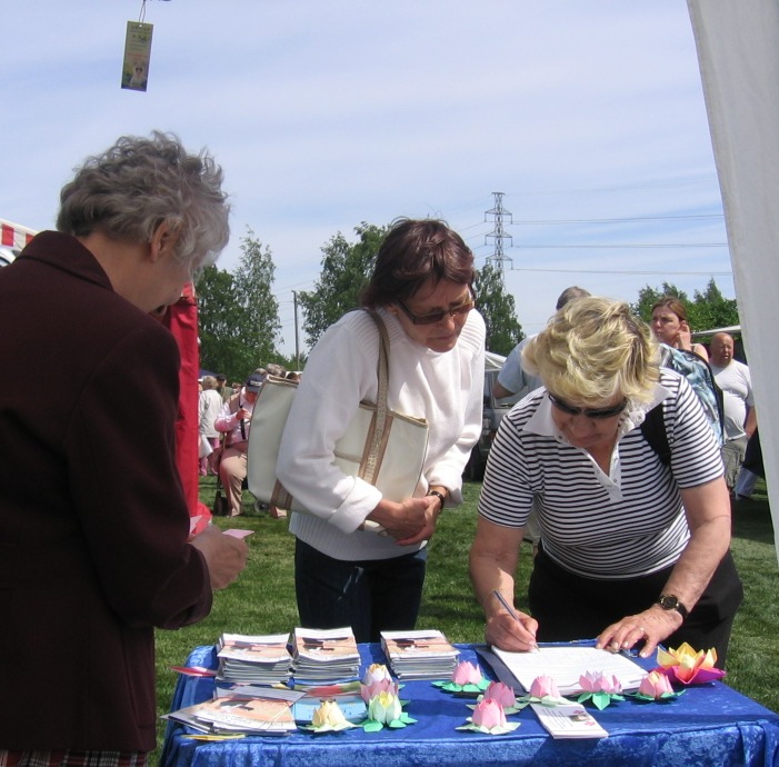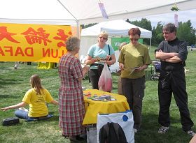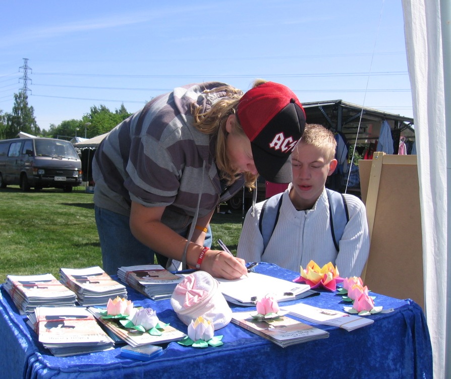 许多人走到法轮功学员的摊位前,有的看展板,有的欣赏学员舒缓的炼功演示,还有人当场学炼;更有很多人是被美丽的莲花引领到法轮功的展台前的。法轮功学员递上洪法传单,赠送莲花,讲解什么是法轮功、法轮功洪传世界和九年来中共邪党迫害的真相,吁请人们签名制止迫害。