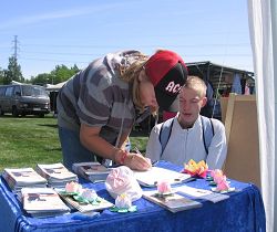 ![]() 两个十五、六岁的大男孩,先是对纸莲花感兴趣,接着去看展板,当学员给他们讲了真相后,又去认真的签上自己的名字声援反迫害。 |