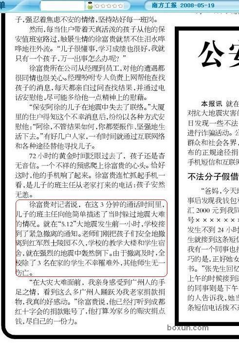 5月19日,中国广州《南方工报》一篇“三分钟通话 悲喜两重天”的新闻报导显示:汶川某学校在地震前1小时,接到紧急通知,于是老师带着学生紧急撤离而避免了伤亡。《南方工报》网络版已删除该报导,下面是报纸的缩印图: