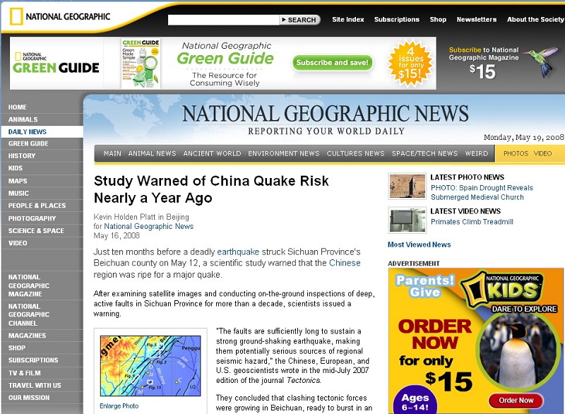 ![]() 图1:新华社新华网:甘肃省委书记陆浩高度评价地震局对汶川大地震的预测 |