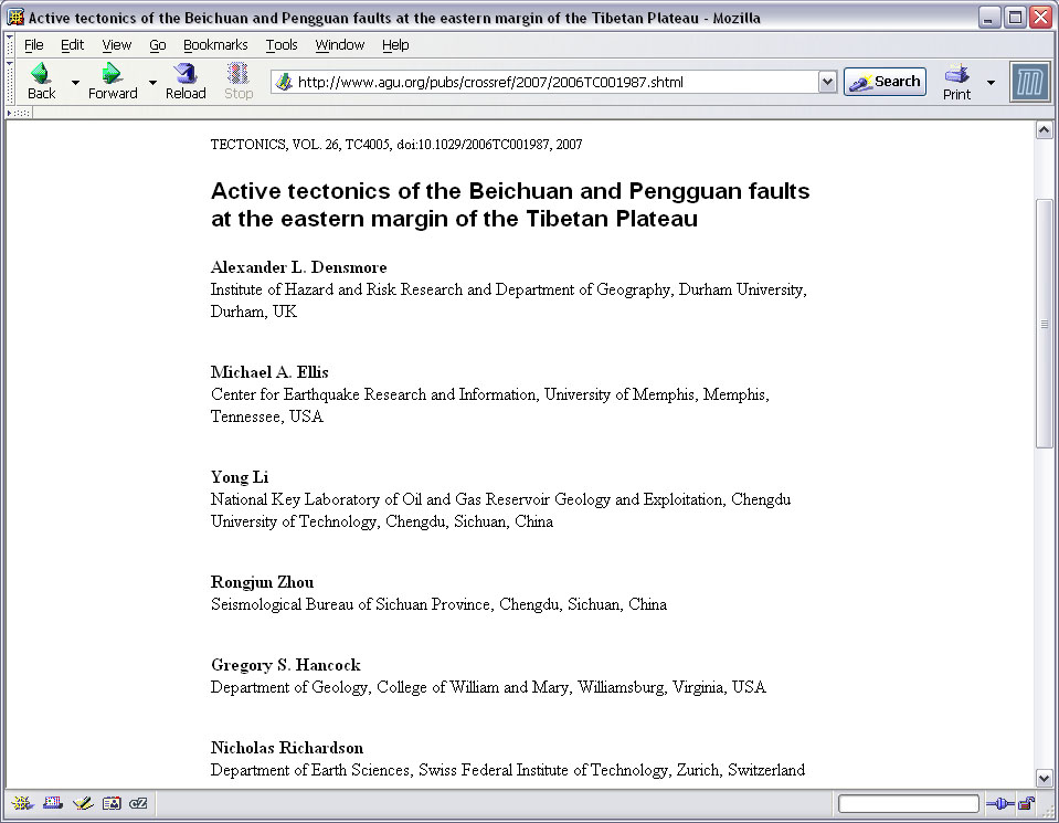 该文第三作者李勇,成都理工大学油气地质及开发国家重点实验室教授;第四作者周荣军,是四川地震局工程师。该文2006年4月28日寄出,该研究项目还得到中国国家自然科学基金(基金号:49802013)和美国自然科学基金(基金号:EAR-0125565)等的联合资助。