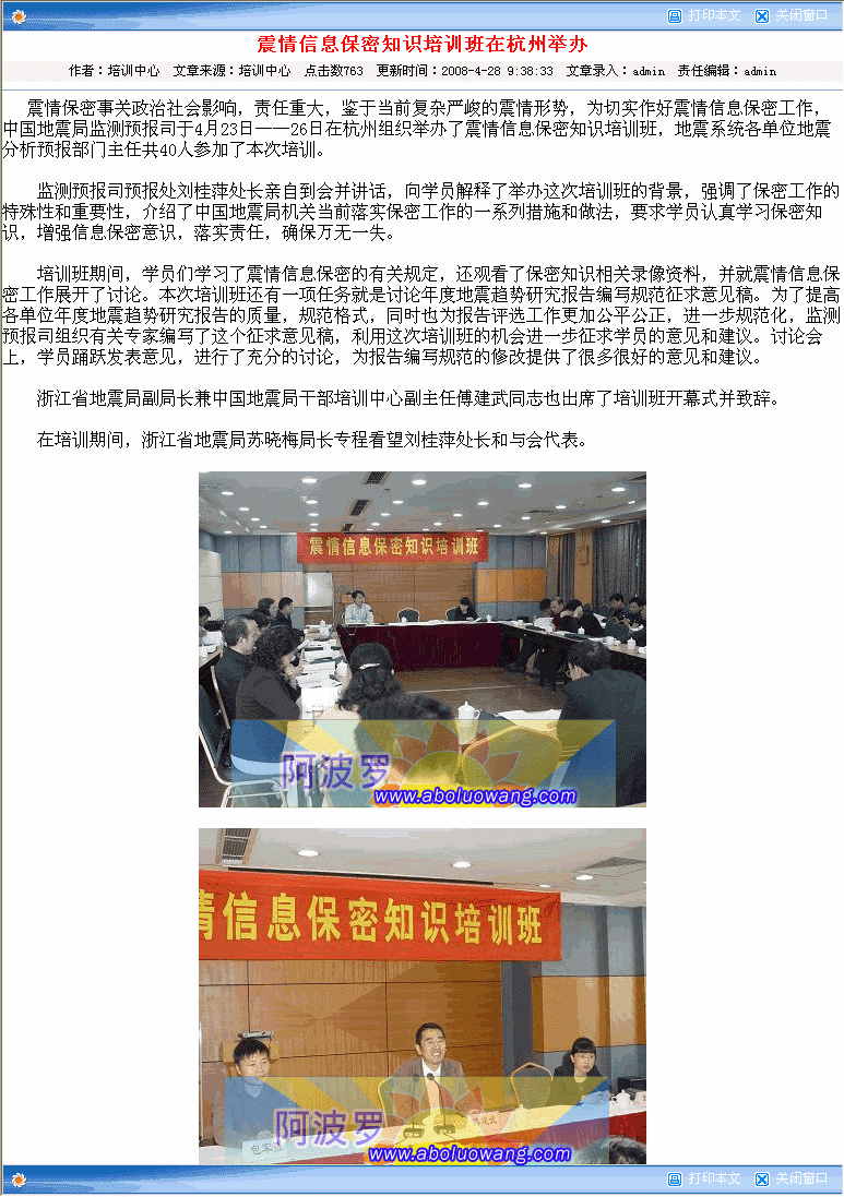 震情保密事关政治社会影响,责任重大,鉴于当前复杂严峻的震情形势,为切实做好震情信息保密工作,中国地震局监测预报司于4月23~26日在杭州组织举办了震情信息保密知识培训班,地震系统各单位地震分析预报部门主任共40人参加了本次培训。