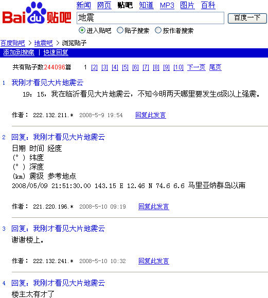 ![]() 图8: 百度贴吧――地震吧做出的预报 |