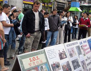 退党服务中心的义工们刚把揭露中共迫害法轮功的图片摆出来,人们马上就聚拢过来观看。当看到一幅幅图片中中共警察对手无寸铁的老人、妇女暴力殴打、电击,实施各种酷刑时,人们脸上流露出震惊和难过的表情。一位老先生看了图片后连连摇头叹息说:“共产党走到哪里就把灾难带到哪里,这真是人类的灾难啊!”许多人在看了图片后都会毫不犹豫的过来签字反迫害,声援三千七百万人退出中共党、团、队。前来签字的人几乎没有断过,签字桌前常常排起长队。