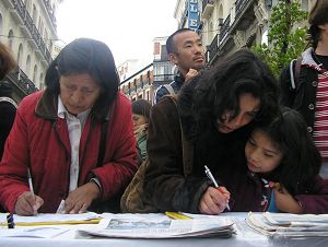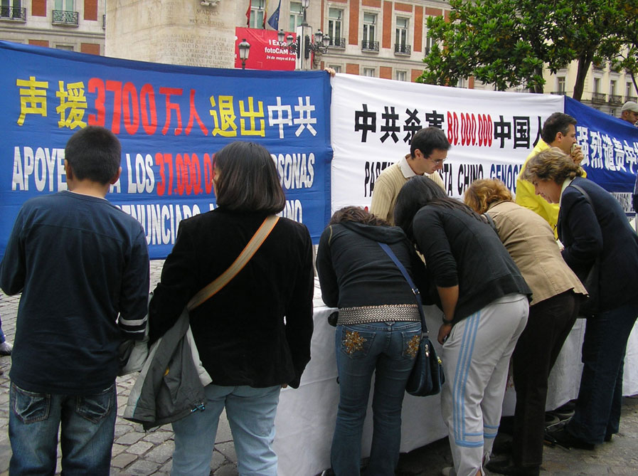 签字声援的人有不同国家不同种族的,其中也有中国人。有三位中国人在明白了真相后现场声明三退。一位中国小伙子说,他的祖父就是文革时被害死的,他的父亲也因此而受到株连。很多中国人接受了《九评共产党》和真相光盘。