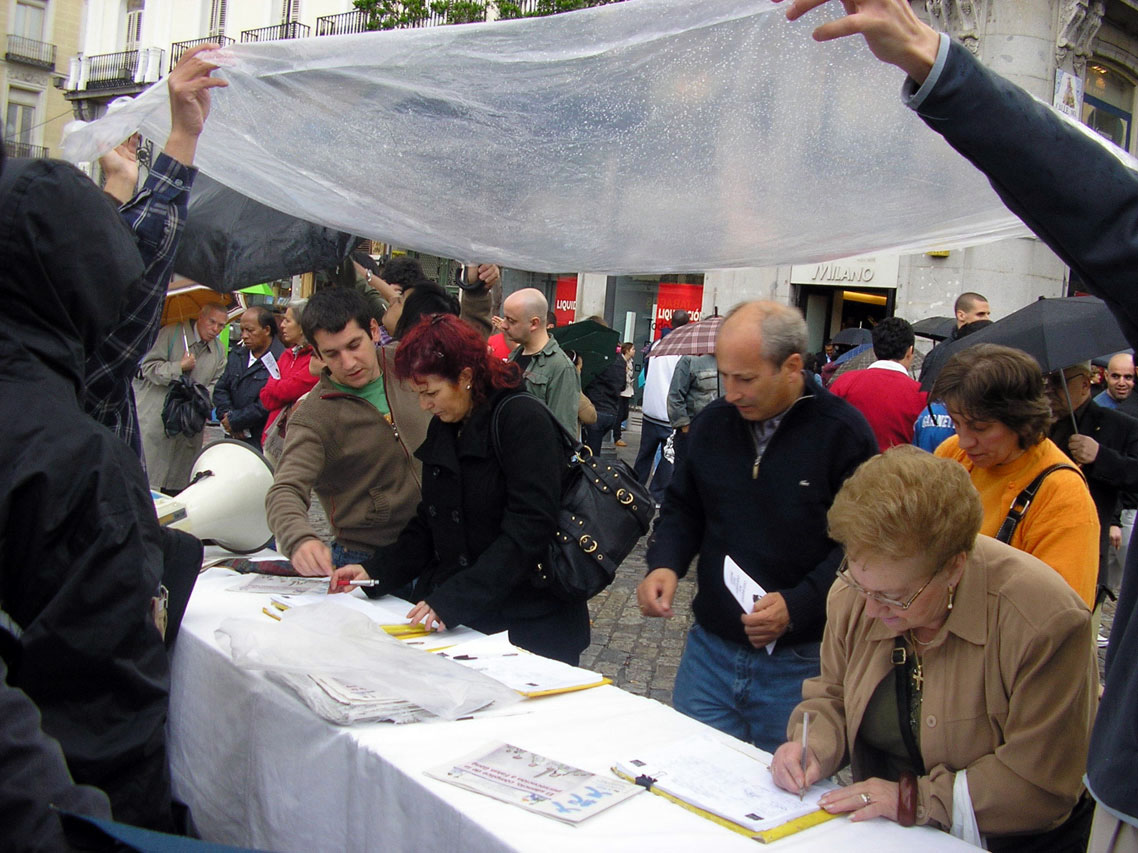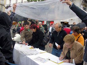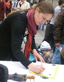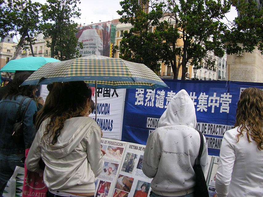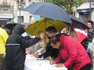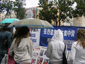集会开始不久,本来就阴云密布的天空下起了雨,但那些善良的市民、学生和各国游客依然冒雨签字声援法轮功和中国民众退出中共。有一阵风很大,几次将图片板刮倒,但马上就有路人过来帮助扶起图片板;一位来自东欧国家的中年人热心的帮助加固横幅,他说:“我曾在共产党统治下生活了三十多年,我很了解共产党的邪恶,我支持你们,坚持!坚持!你们一定会胜利。”