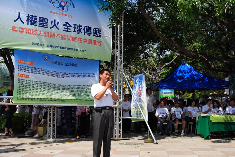 立法委员江义雄举起圣火点燃圣火台,他呼吁民众共同制止中共对法轮功的迫害。
