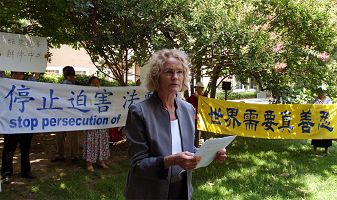 二零零八年七月十一日中午,美国首都华盛顿地区部份法轮功学员在中共驻美国大使馆前集会,抗议中共借用奥运,疯狂抓捕、迫害法轮功学员,并把暴行延伸到美国。