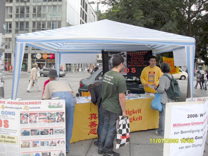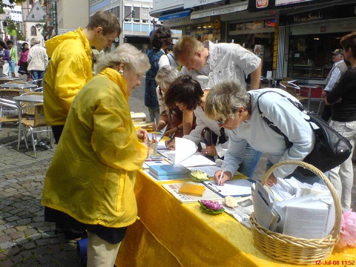 一位德国巴伐利亚人,在回家的路上看到了令他震惊不已的法轮功学员受迫害的图片和横幅,于是他请法轮功学员解释他看到令人发指的图片是什么意思。因为前不久他和妻子到过中国旅游,他们体会到在那里中国极权是如何严酷的对待它的百姓的,他对中国极权的认知停留在民工、三峡移民和强征农民土地上。但是现在他了解到对法轮功的迫害是如此严重,此前他对此毫无所知,迫害的严酷使他无法继续沉默,他马上签名反对这种罪恶的迫害。