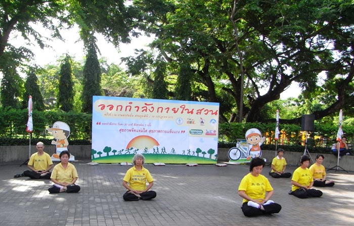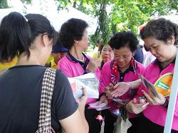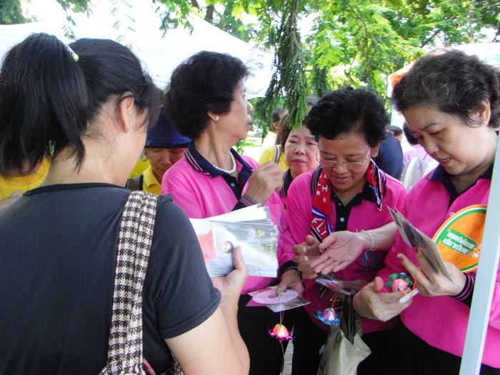 祥和动听的炼功音乐伴随着优美的炼功动作和简练精辟的功法解说,引起了民众的关注和兴趣,纷纷索要炼功和真相资料,甚至其他参展团体也争相询问索要法轮功简介、光碟和莲花书签。