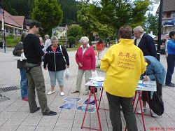 一位德国大学生问:他周围的中国留学生为什么拒绝真相,对中共当局认识不清?学员告诉他:这些留学生是在中国的“党文化”中长大的,受共产党欺骗,不愿意或没有机会了解真相,但毕竟他们已经在海外,能够看到法轮功在海外洪传,抗议残酷迫害的浩大声势,和国际来自各界的正义呼声与支持,一旦他们能够认真的思考一下,就会明白真相。