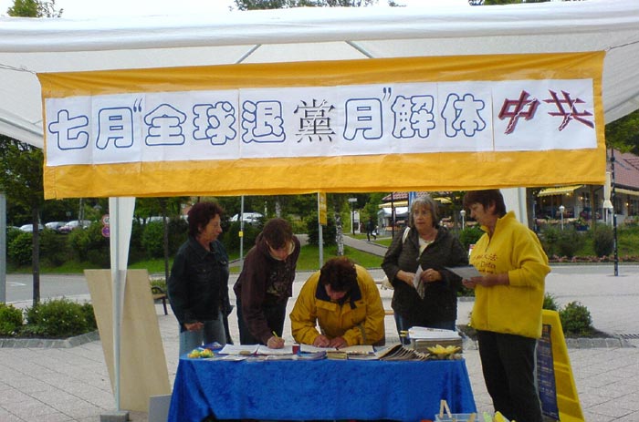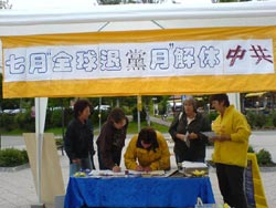 下午陆陆续续来了几个中国旅游团,他们远远就看到了我们的信息台。不少人随队伍往前走,但眼光追逐着横幅、展板上的标语。学员走到他们身边平和地说:“为你们好,别拒绝真相,接过去看看吧。”不少中国游客悄悄接过资料并对我们说谢谢。一位游客开始没接资料,走出几步远又回来说:“给我一份吧。”有位老先生多次向我们挑起大拇指,我们问他:“您三退了吗?”老先生笑着说:“已经退了。”有些中国游客临走时再次经过我们信息台,特意拍照片,他们是想把“天灭中共!天佑中华”的信息带回给国内的亲人朋友吧。
