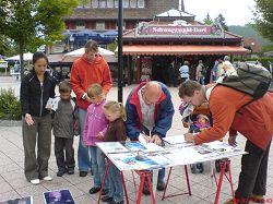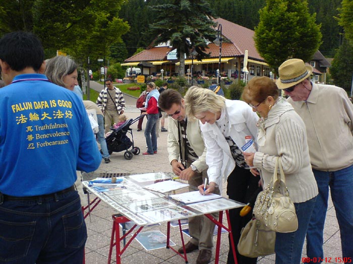 当天,旅游景点游客络绎不绝。我们的信息台又设在了景点的入口处。游客们经过时纷纷驻足观看,展示中共恶警对法轮功学员施行的惨无人道的酷刑图片使很多人惊呆了,有人不敢相信这是真的。一个五、六岁的小女孩拽着妈妈问:“怎么会这样?这样人不就死了吗?”当了解到这些都是事实并且至今仍在发生着时,他们争相签名,支持法轮功,制止中共迫害。