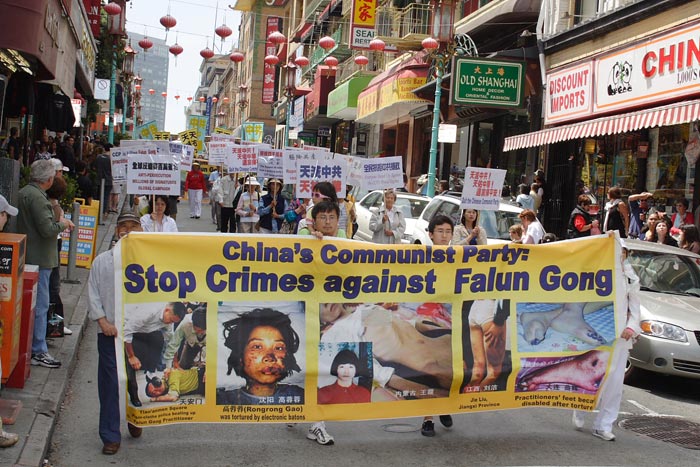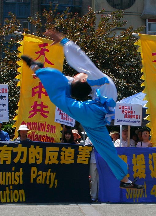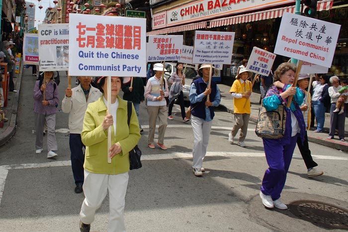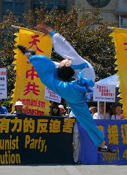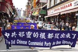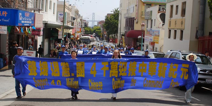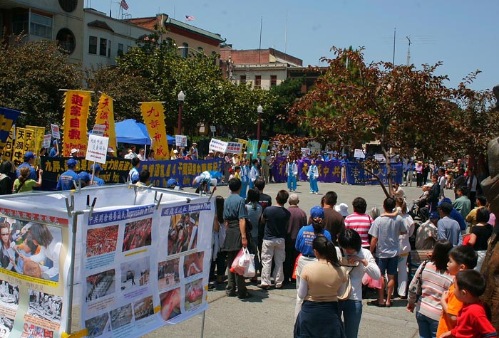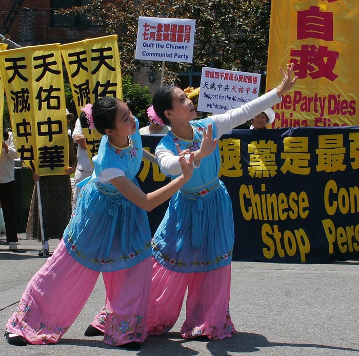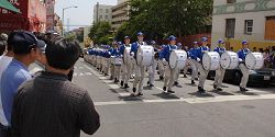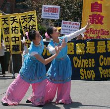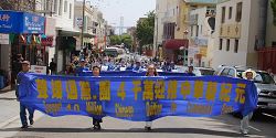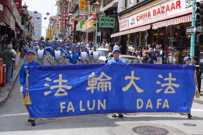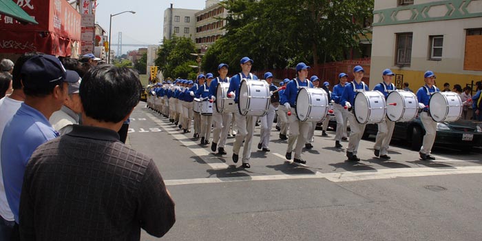 当日旧金山风和日丽,由上百名法轮功学员组成的美西天国乐团前来助阵。中午时分,鼓乐声声由位于旧金山购物中心区的繁华路段都板街穿越而行,然后进入中国城,最后抵达华人聚集的花园角公园。明慧学校的小朋友在此载歌载舞,吸引过往路人驻足观看。