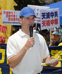 湾区法轮功西人学员、天国乐团指挥亚拉伯罕在集会上讲述了法轮功学员为何支持退党。