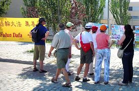 六月二十九日,法轮功学员来到作为世博会标志建筑之一,跨越西班牙大河埃布罗(Río Ebro)的志愿者步行桥(Pasarela del Voluntariado)桥畔洪法。伴随着祥和悦耳的炼功音乐,优美舒缓的五套功法展示着法轮大法的美好。纷至沓来的游客有的接真相传单;有的驻步留足,饶有兴趣的观赏学员炼功;有的在树荫下细细看起大法简介及揭露中共迫害法轮功的真相展板;也有的摄影留念;还有的高兴的说:过完了假期,就到炼功点来学功。