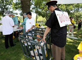 ![]() 集会现场,揭露中共活摘法轮功学员器官的模拟演示 |