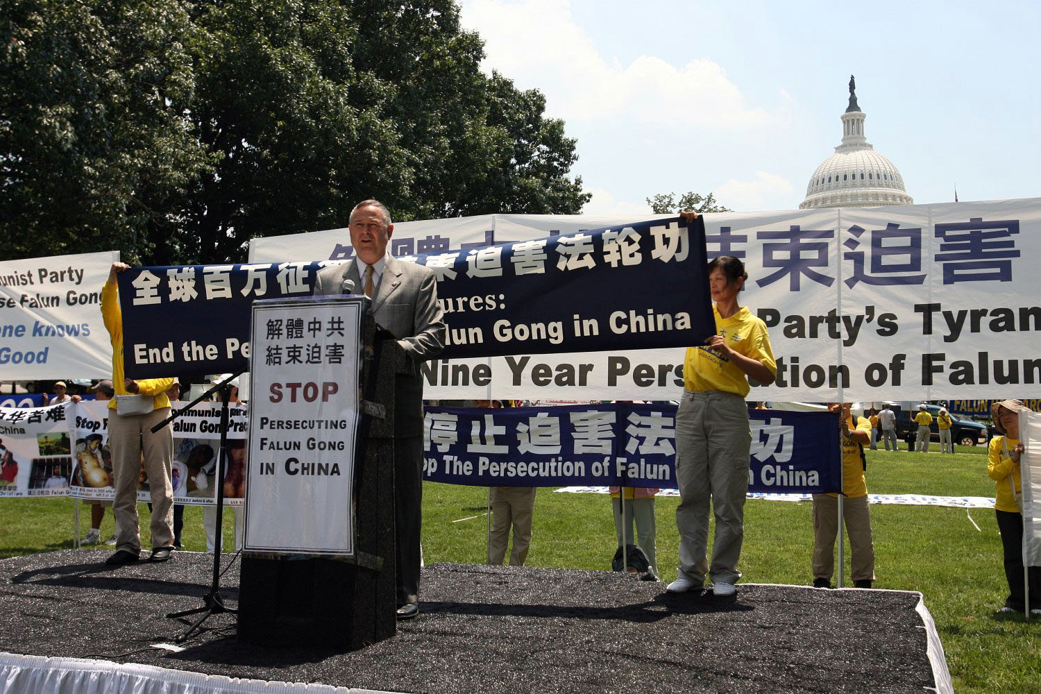 当日华盛顿DC气温高达九十多华氏,在烈日下,身着黄色T恤的法轮功学员有的举着“法轮大法好”、“世界需要真、善、忍”、“结束中共对法轮功的迫害”、“彻底结束劳教所、监狱对大法弟子的非法关押”、“法办迫害法轮功的元凶:江泽民、罗干、周永康、刘京”等横幅,有的举着“停止迫害法轮功”的牌子静静坐在集会讲台前的草地上。