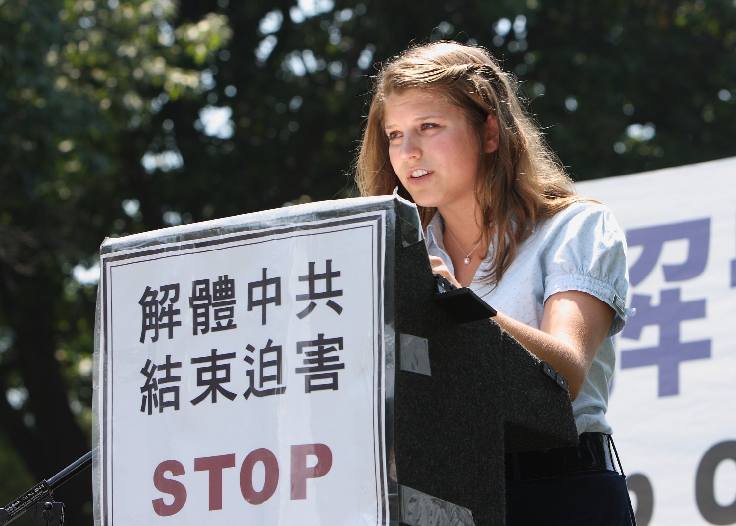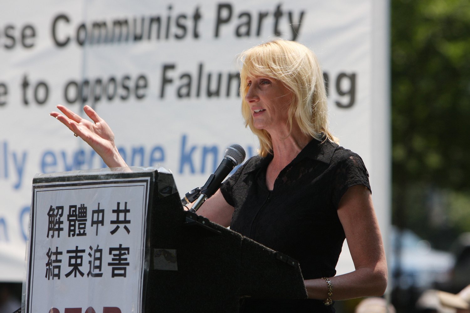 她指出,中共甚至把迫害法轮功的触角伸到美国纽约,中共歹徒攻击在法拉盛图书馆前,和平发送真相资料的法轮功学员。她特别提到中共驻纽约总领事彭克玉亲口承认暗中操纵法拉盛攻击事件的电话录音。她并表示:“在美国的土地上中共的外交官策划攻击美国公民,这种人应当被外交部宣布为不受欢迎的人,然后被驱逐出境!”