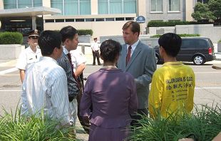 法轮功学员白宫国务院前要求驱逐彭克玉(图)