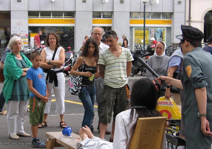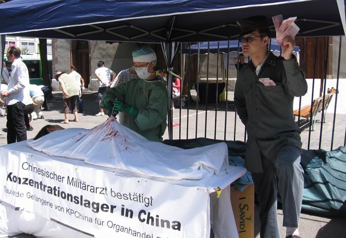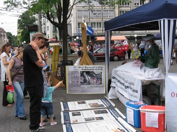 因为当天正好有巴塞尔军乐表演节的游行,所以路人纷纷来到游行必经之地——Clara广场。当他们从公车上下来的时候,很多人被眼前的这一幕惊呆了:一个矮小的笼子,坐在里面的人似乎被拦腰折叠着,因为根本都直不起腰来。长板凳上的林女士看上去受了重伤,手被反扣在身后,身上还“绑”着一条粗的铁链,在长条凳的左边是一位老年妇女,看上去也是伤痕累累的样子,被吊在木架子上。再往左看,情况更为严重,在帐篷里手术台上似乎正在进行开肠破肚的手术,旁边还站着一位“中共警察”手里摇着大把的钱。手术台前的横幅上写着:“中国军医证实:在中共的集中营里,法轮功学员被活摘器官。”