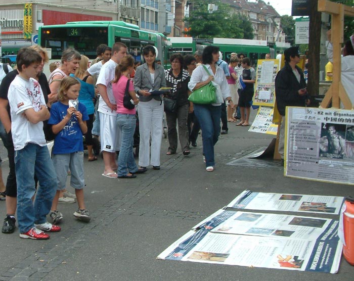 为了让那些孩子不用再担心自己父母的安危,为了制止九年来中共对法轮功学员的迫害,二零零八年七月十九日,法轮功学员在瑞士第三大城市巴塞尔(Basel)的Clara广场上展示功法,并演示法轮功学员在中国所受到的酷刑。
