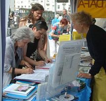 有人仔细看过铺在地上的各种揭露迫害真相的签名板后,签上了自己的名字,有人在和法轮功学员交谈后,签名了,有人看到了平和的功法演示和触目惊心的反酷刑展签名了……他们都希望能够尽快制止这场已经持续了九年的对好人的迫害。