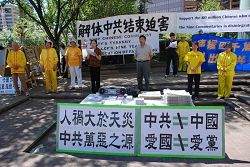 报导说,法轮功学员在卡尔加里市中心中国城附近举行活动,抗议中共,要求在北京奥运会前结束对法轮功的迫害。抗议活动引起了许多路人的关注。