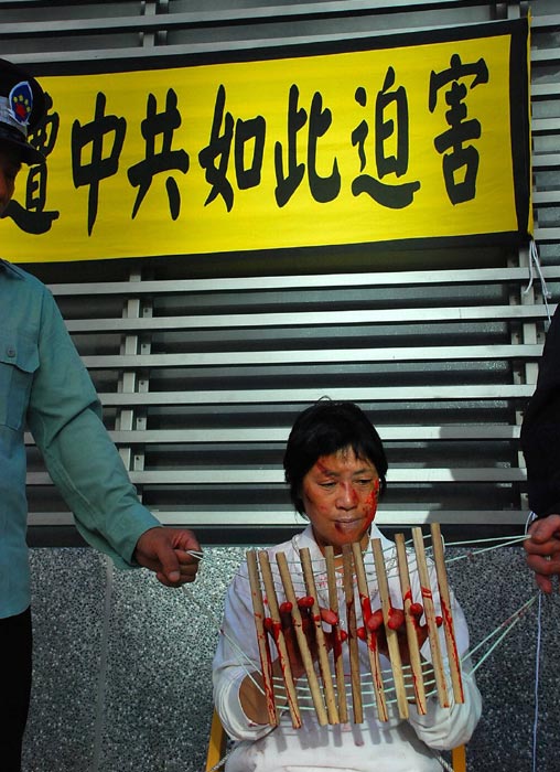 ![]() 法轮功学员模拟演示中共酷刑──吊打 |