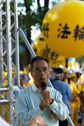 高雄县副县长叶南铭发言时表示,每次参加法轮功的活动,心里“很敬佩”和“不忍”,敬佩法轮功了不起的精神,不忍的是很多中国境内法轮功学员正在遭受迫害,生命不保。希望海外要多举办这种声援活动,海外正义人士要发声营救他们,减轻他们的被迫害。叶南铭说高雄像宗教联合国,很尊重基本人权且有三个特点,第一台湾有言论自由,开放大陆人士来台观光,大陆来台人士很羡慕我们可以民选总统,可以骂自己的总统。第二台湾有集会结社自由,尊重每个人的选择、宗教自由,如法轮功学炼自由。第三台湾有免于被迫害自由,在中国,人民被迫害要退出共产党还需用假名才不会被迫害,真希望这三项对岸能效法台湾,能在全中国实施。