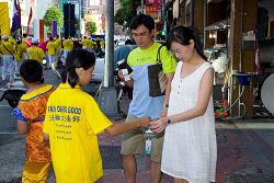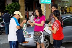 ![]() 民众很开心的接受学员赠送的真相资料和莲花 |