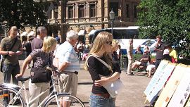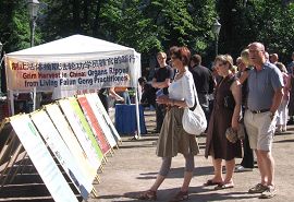 一位芬兰女士接了传单后对学员友好的说,我知道法轮功,我非常支持法轮功。