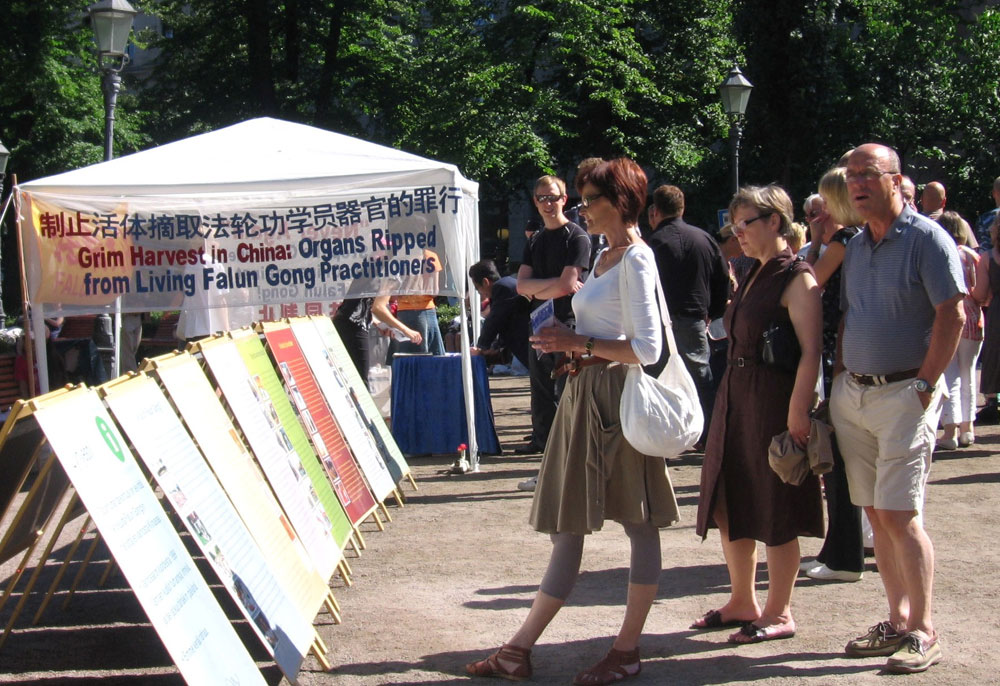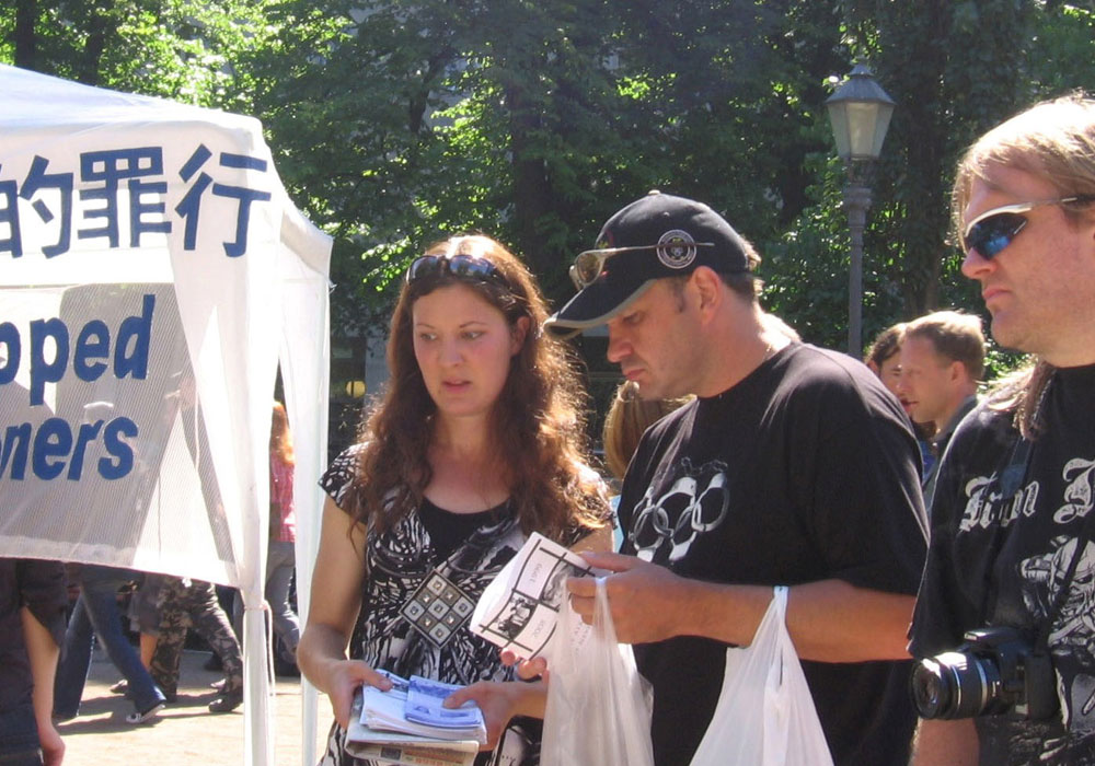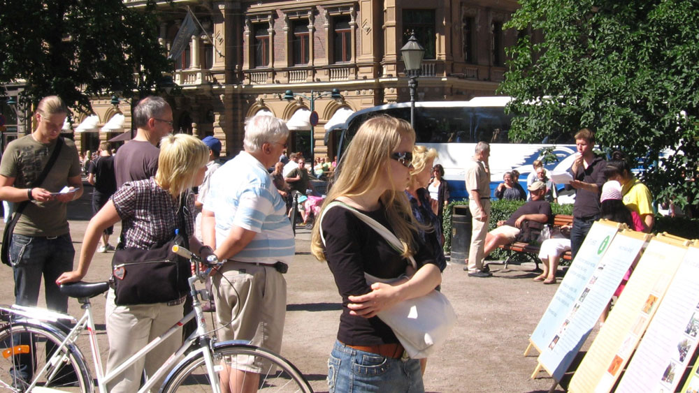 九年来法轮功学员秉承“真、善、忍”的原则,以坚强的信念不屈不挠的进行反迫害,用各种和平方法,在各国、各地、各种场合,持续不断的讲真相,已使世界很多国家和民族的政府及民众了解了真相、加入了反迫害的行列。当天途经活动场地的有来自瑞典、法国、德国、英国、以色列、俄罗斯、爱沙尼亚、泰国、土耳其、卢森堡等多国游客和芬兰民众,他们有的签名声援,有的赞扬学员的和平反迫害行动,有的与学员攀谈,提出自己的疑问,或想了解更多真相,更有直接伸出援手相助的。
