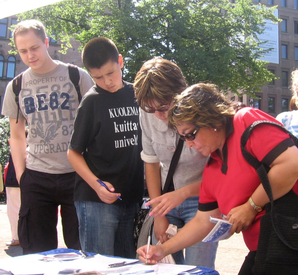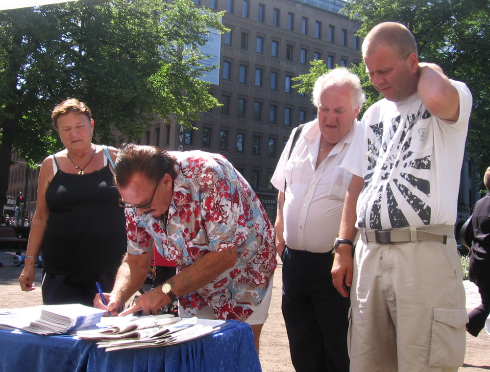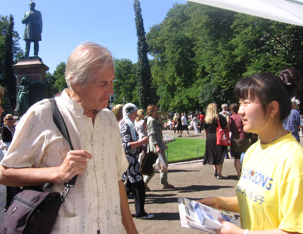一位老人自己先签了名,然后向学员要了更多的芬兰文及俄文、英文真相传单。他说,他是赫尔辛基一教会的成员,在他们教会有不同国家的教友,他希望更多的人知道法轮功受迫害的事,他要联系更多的人来帮助法轮功。学员满足了他的善愿,并向他表示深深的谢意。