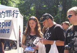 人们驻足倾听着吕适平以亲身经历揭露中共九年来对法轮功学员的迫害罪行,之后征签簿上又增加了更多的签名者。